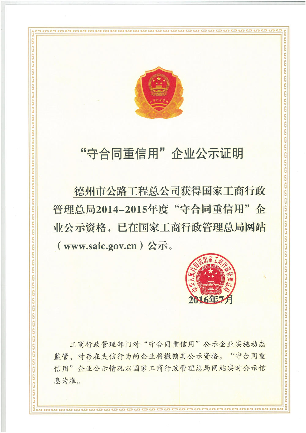 全国守合同重信用荣誉称号